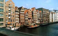Bebauung der Wasserseite mit „Aussendeichhäusern“. Dort sind alle Funktionen des Kaufmannshauses vereinigt: Arbeiten und Feiern in der großen Diele und Wohnen im ersten Obergeschoss. In den darüber liegenden Geschossen bis unter das Dach befanden sich die Speicher. |
